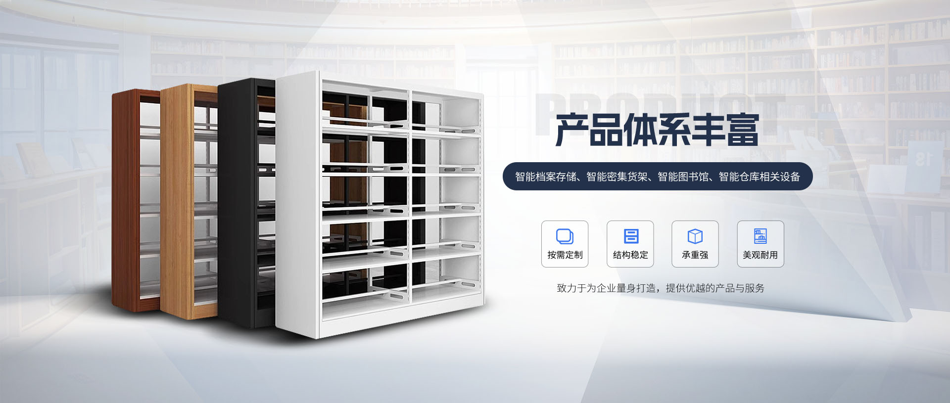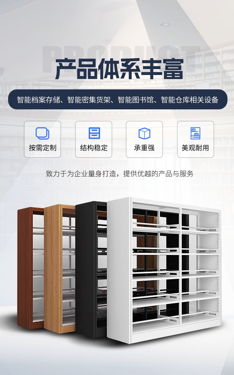 产品丰富,涵盖智能档案存储、智能密集货架、智能图书馆、智能仓库相关设备,包括书架、期刊架、阅览桌椅、图书车、图书电梯等
